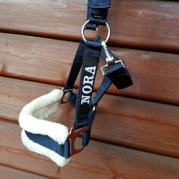 auf einen Lederstreifen in deiner Wunschfarbe gestickt und auf das Halfter genäht.