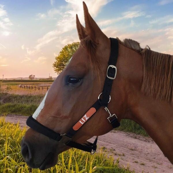 Der Name deines Pferdes wird auf einen Lederbesatz deiner Wunschfarbe gestickt und auf dem Nasenteil und/oder auch auf einem oder beiden Backenstücken aufgenäht.