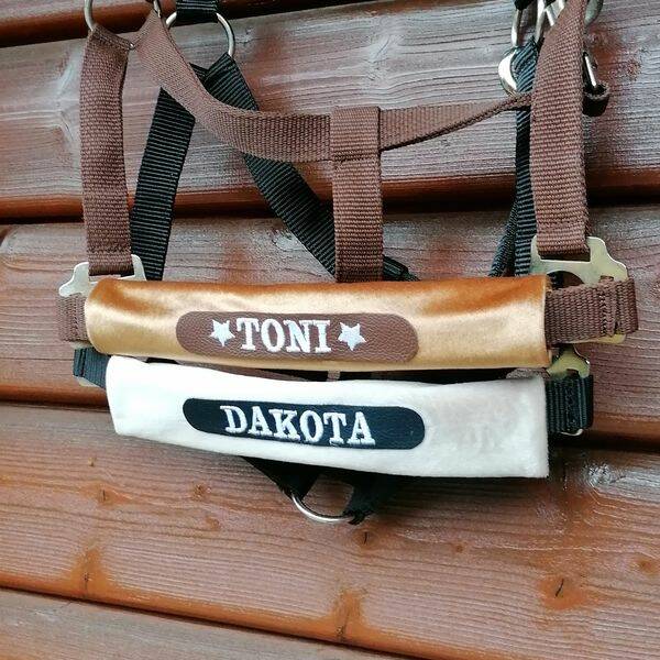 Versehen mit einem Lederstreifen, auf dem der Name deines Pferdes eingestickt ist.