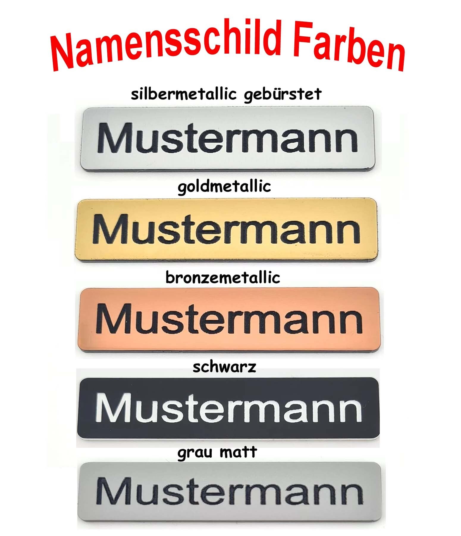 Auf dem linken und/oder rechten Backenstück mit einem Namensschild in Edelstahl Optik versehen.